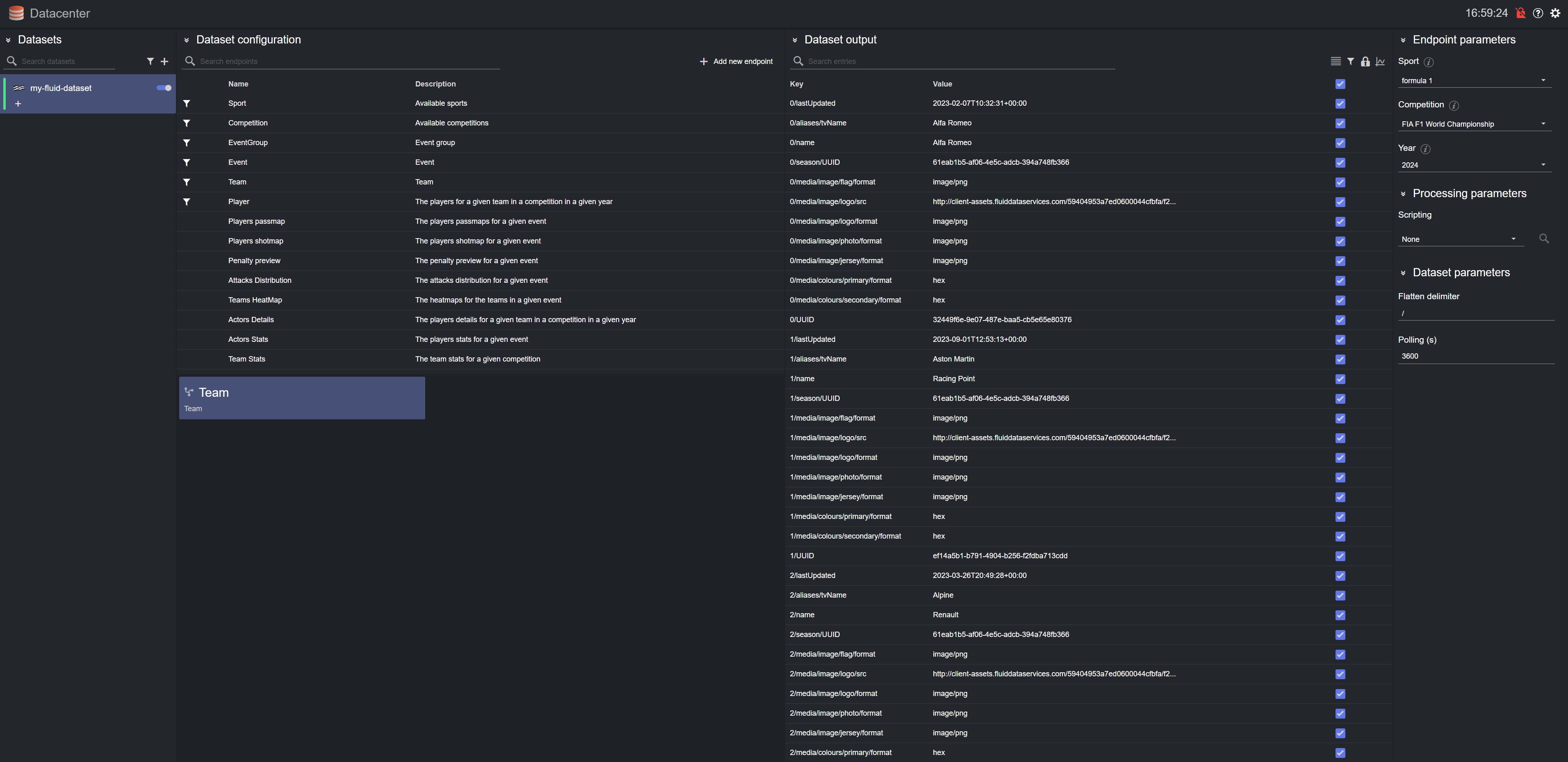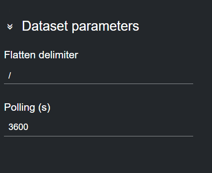 To change the polling rate (how often the Fluid remote host is polled for data, in s) for the dataset, select an endpoint card from the list and edit the Polling field in the Dataset parameters on the right-most column.