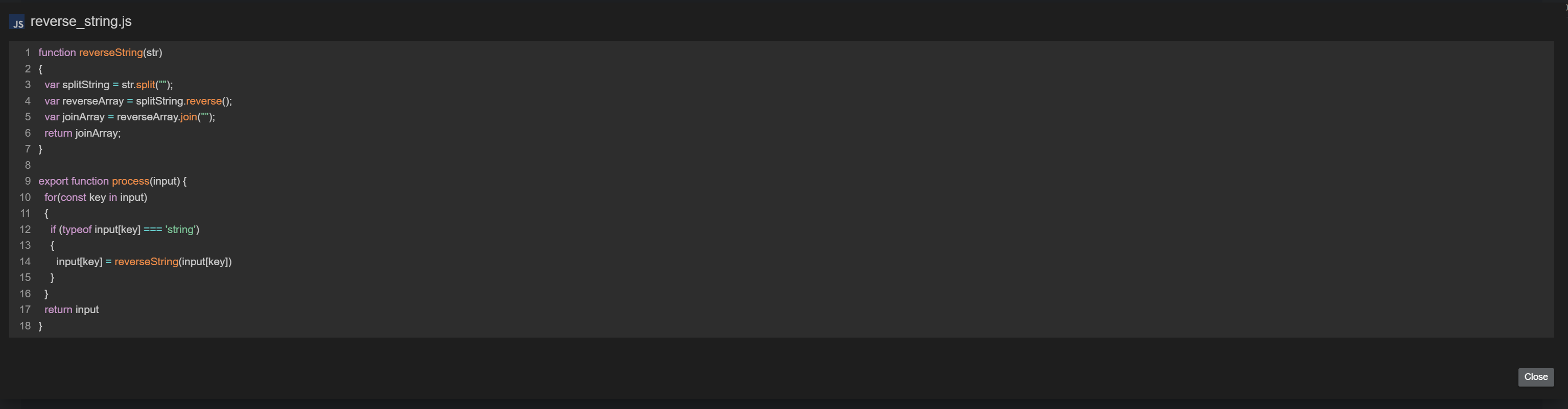 export function process(input) { var obj1 = JSON.parse(input.data); var obj2 = JSON.parse(input.data_1); return { a: obj1.key11, b: obj2.key21, c: obj1.key12 + obj2.key22 }}The output data is then three keys (a, 1), (b, 3) and (c, 6).