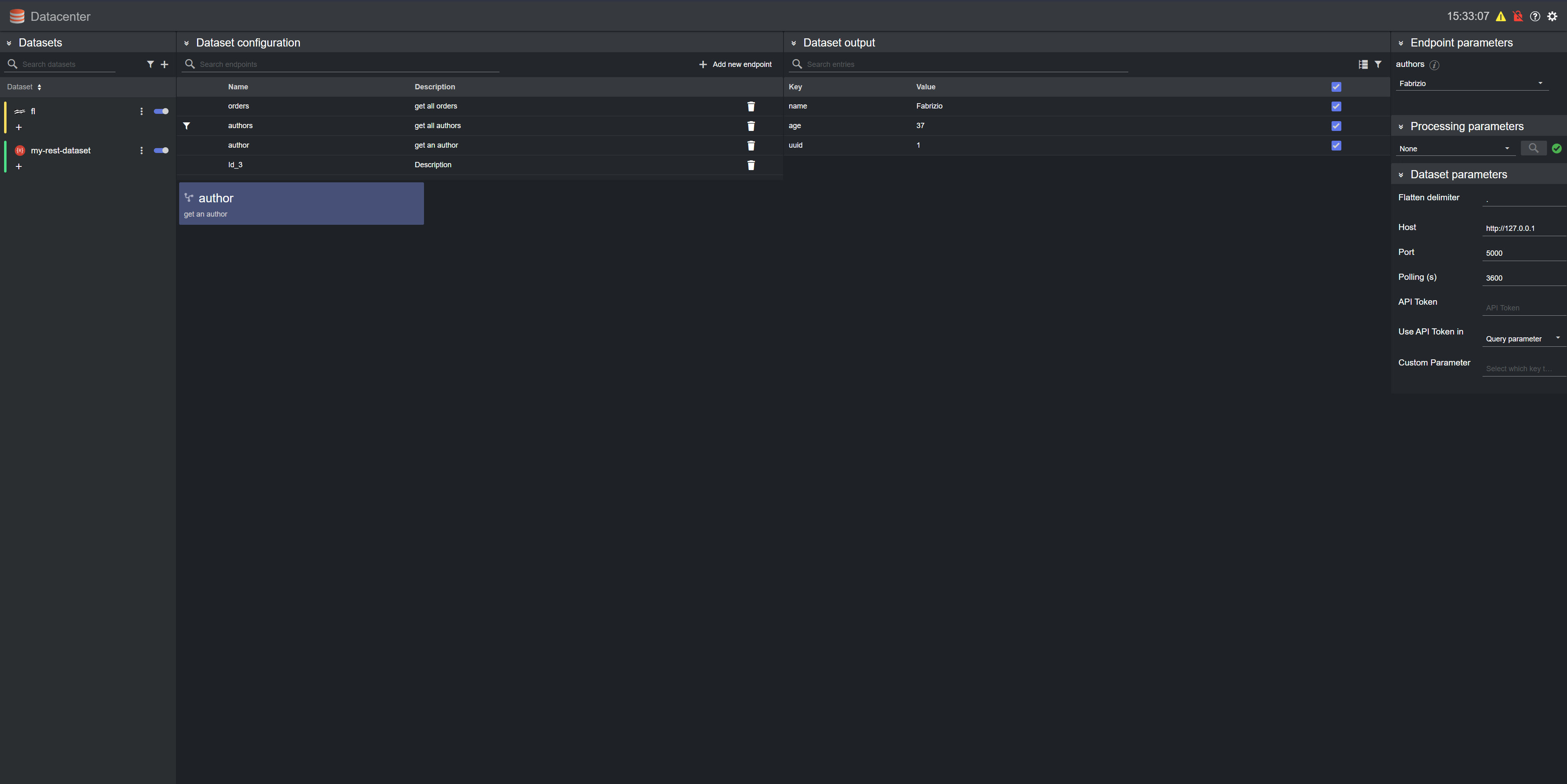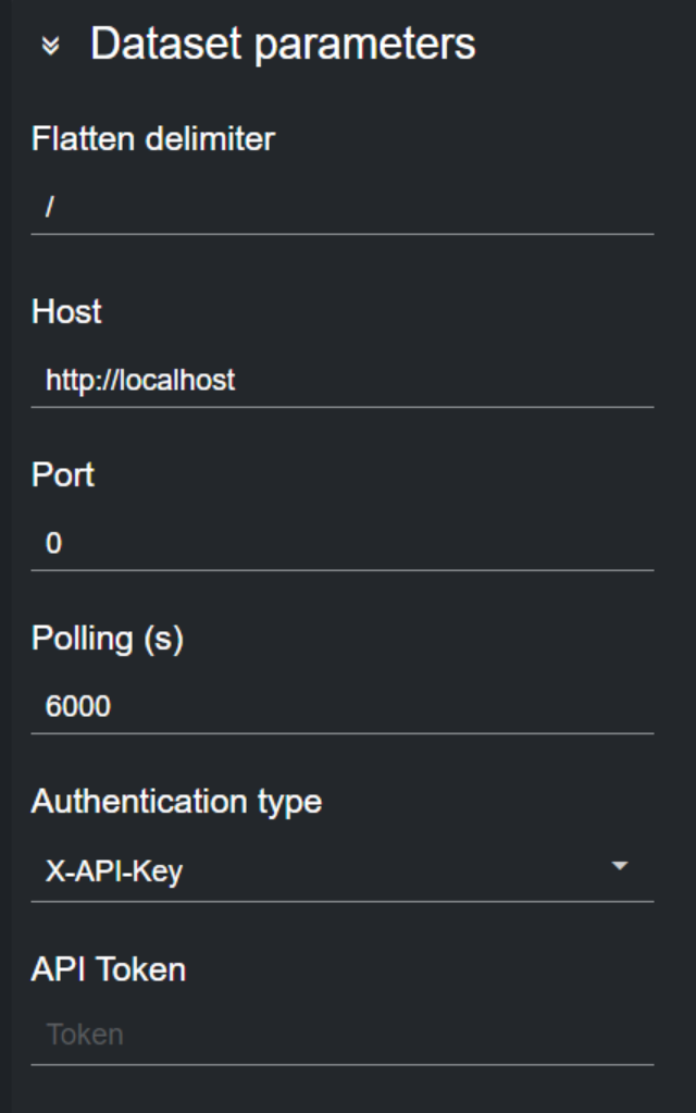 To change the polling rate (how often the remote REST host is polled for data, in seconds) for the dataset, select if from the list and edit the Polling (s) field in the Dataset parameters on the right-side column.