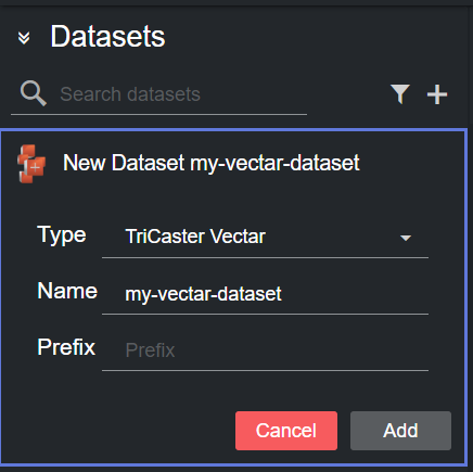 Create a new dataset of type TriCaster Vectar, specifying a name and (optionally) a prefix to use to identify the dataset and its values: