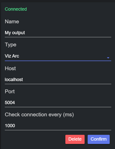 To create an output of type Viz Arc, add a new output and click on the new entry.