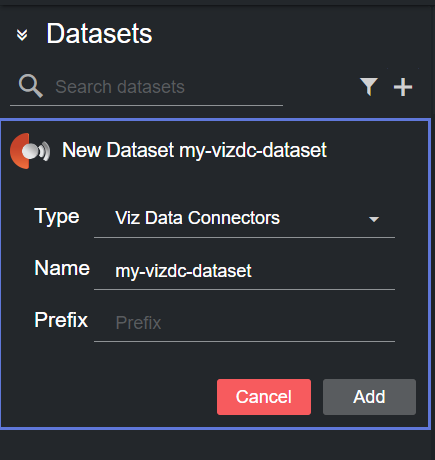 Create a new dataset of type Viz Data Connectors, specifying a name and (optionally) a prefix to use to identify the dataset and its values: