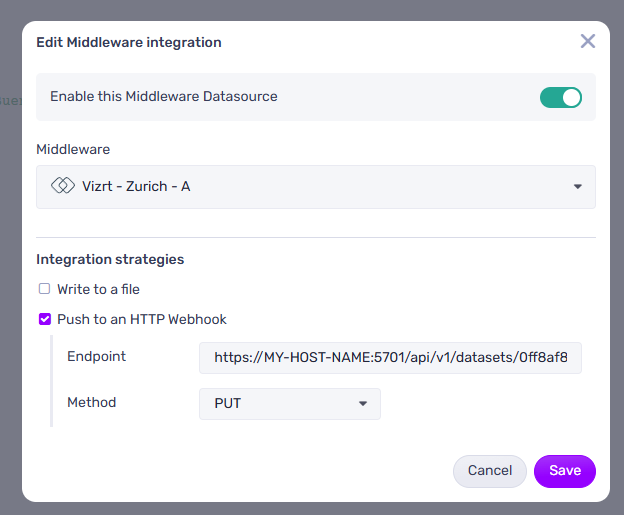 On the Data Source page, locate the Middleware Integration section and click on the Edit button. In the dialog that opens, make sure to enable Push to an HTTP Webhook and in the Endpoint input the Datacenter dataset link shown in the Dataset configuration panel.