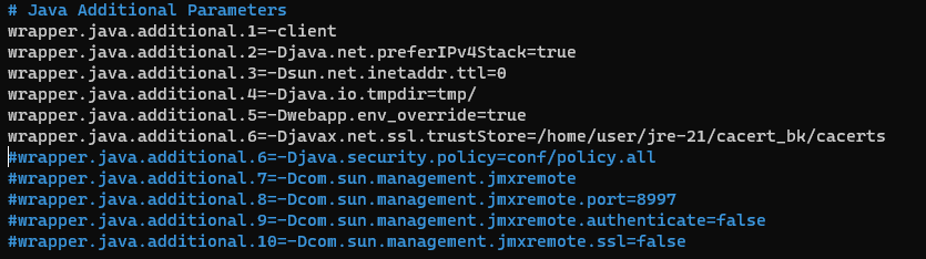 If a copy of the JVM trust store has been used (for example, in /home/user/jre-21/cacert_bk/cacerts), Middleware needs to be made aware of its location. This can be done by adding a line pointing to the modified trust store in the config file /home/user/dev/middleware-cli /conf/middleware.conf. To do so, open this config file and replace the line starting with wrapper.java.additional.6 with the following line: