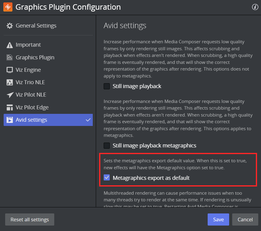 When a user creates a new Vizrt Graphics Plugin effect, the default value for the Metagraphics checkbox is read from a setting. This can be changed in Avid settings.
