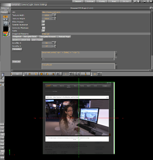 Snapshot: Takes a snapshot of the current browser texture. The snapshot is saved as a file or to the Graphic Hub, as specified in Snapshot Filename.