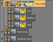 Flow - Data: The 3DLine Tracer plug-in and the VWBReader are added to the container. Underneath it adds three containers with three types of Roads: Low, Medium and High.