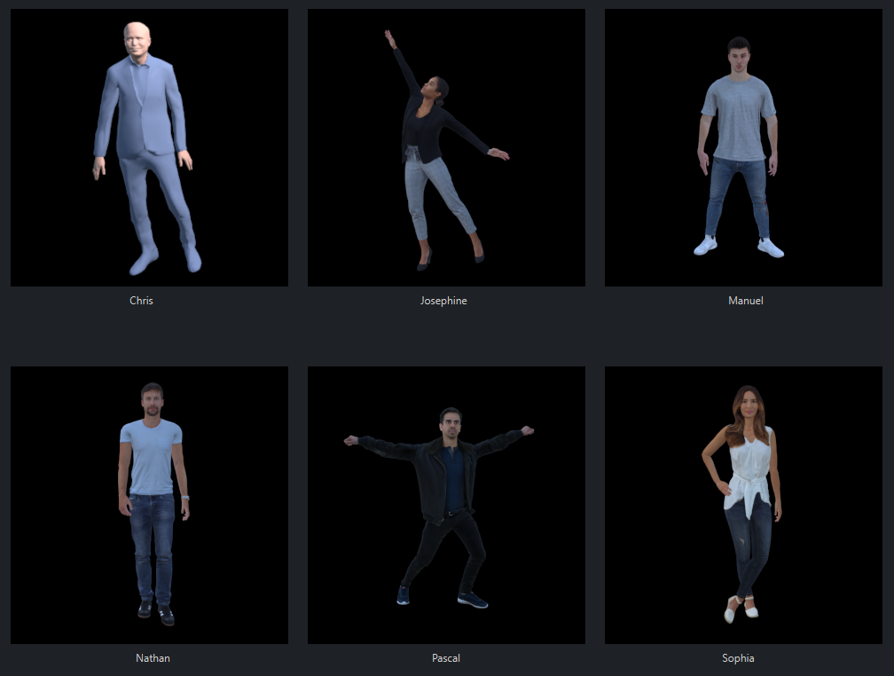 Preset models are rigged models that have already been enhanced and configured with the Reality Connect joint plug-ins, AI Joint, AI Joint Mapper and AI Talent Material. The preset models available with this release are shown in the image below.