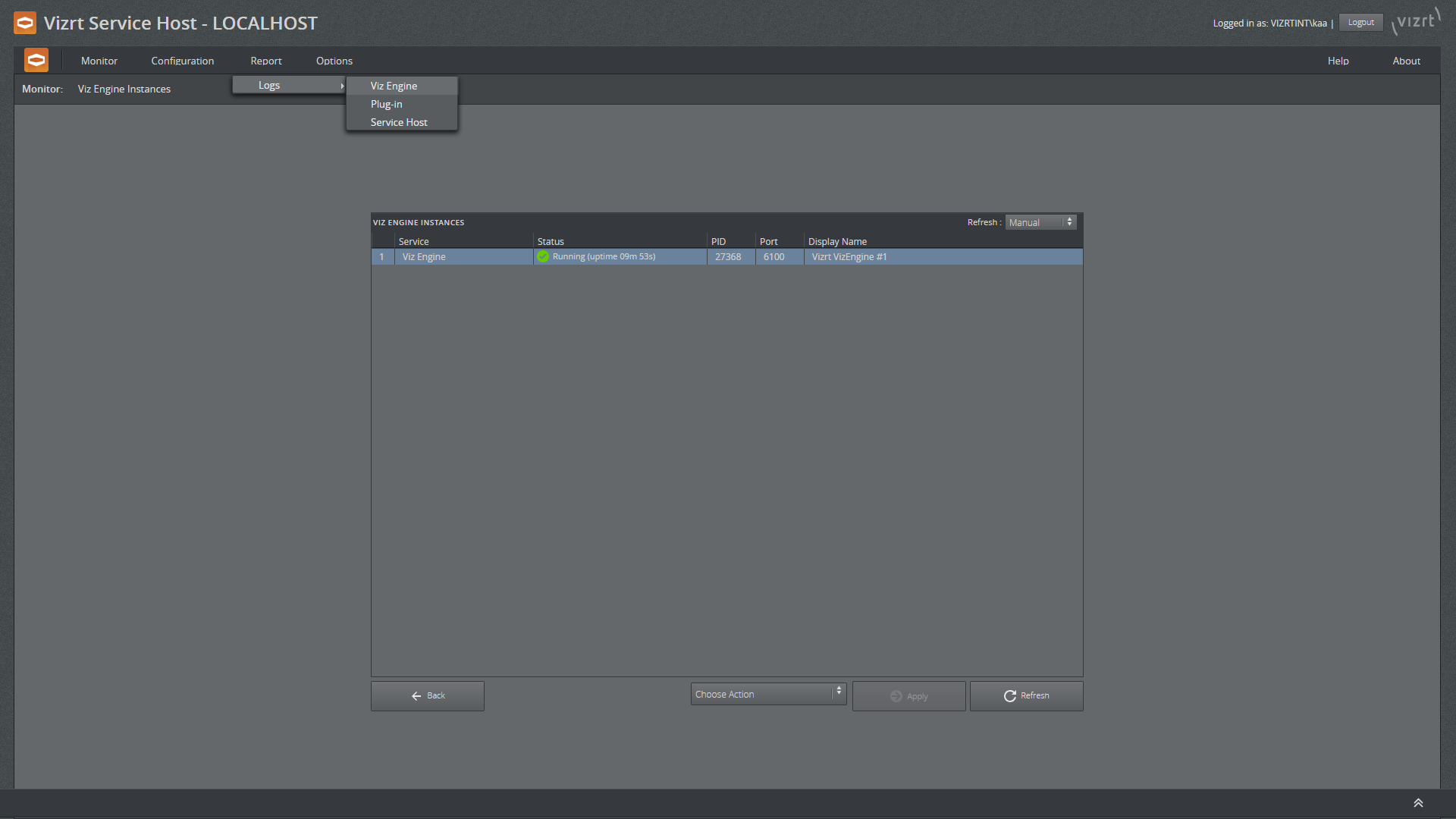 The log file of a Viz Engine instance can be viewed either from the Context menu on the Monitor page or via menu Report > Logs > Viz Engine.