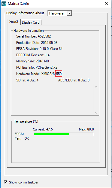 Note: All the above boards should be upgraded to enable recording with different codecs. To check which upgrades the board has available, use the Matrox Utils in the task bar and check if the board has 500 or 550 upgrade applied (for ProRes). If the board does not have this upgrade, this must be ordered. Additionally, to receive RTP/H.264 the Matrox M.264 must have the RTP upgrade. Refer to Recording RTP/H.264 Stream for more information.