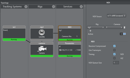 The Parameter Panel shows the configuration parameters for the selected Topology item: Tracking Systems, Rigs and Services.