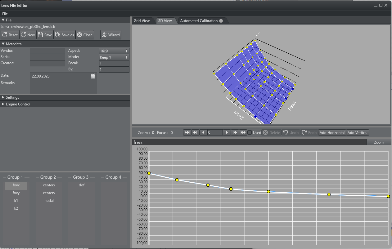 The 2D View is the main view used for calibrating the lens points. Clicking into a point, selects the point in 2D View and 3D View, and dragging the point manipulates the value. Using the mouse wheel, you can zoom in and out (and increase the accuracy of the manipulation).