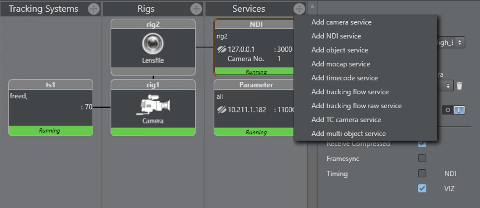 In case the tracker color goes from green to orange and the incoming tracking data is irregular or erratic, the camera needs a reboot. Power off the camera and turn it on again. If the camera data is not coming in correctly after this procedure, check the frame rate and video settings of the Tracking Hub and the camera. The next step is to set up the rig and lens file (please refer to the Configure Topology section). When the topology is set, a NDI service can be added.