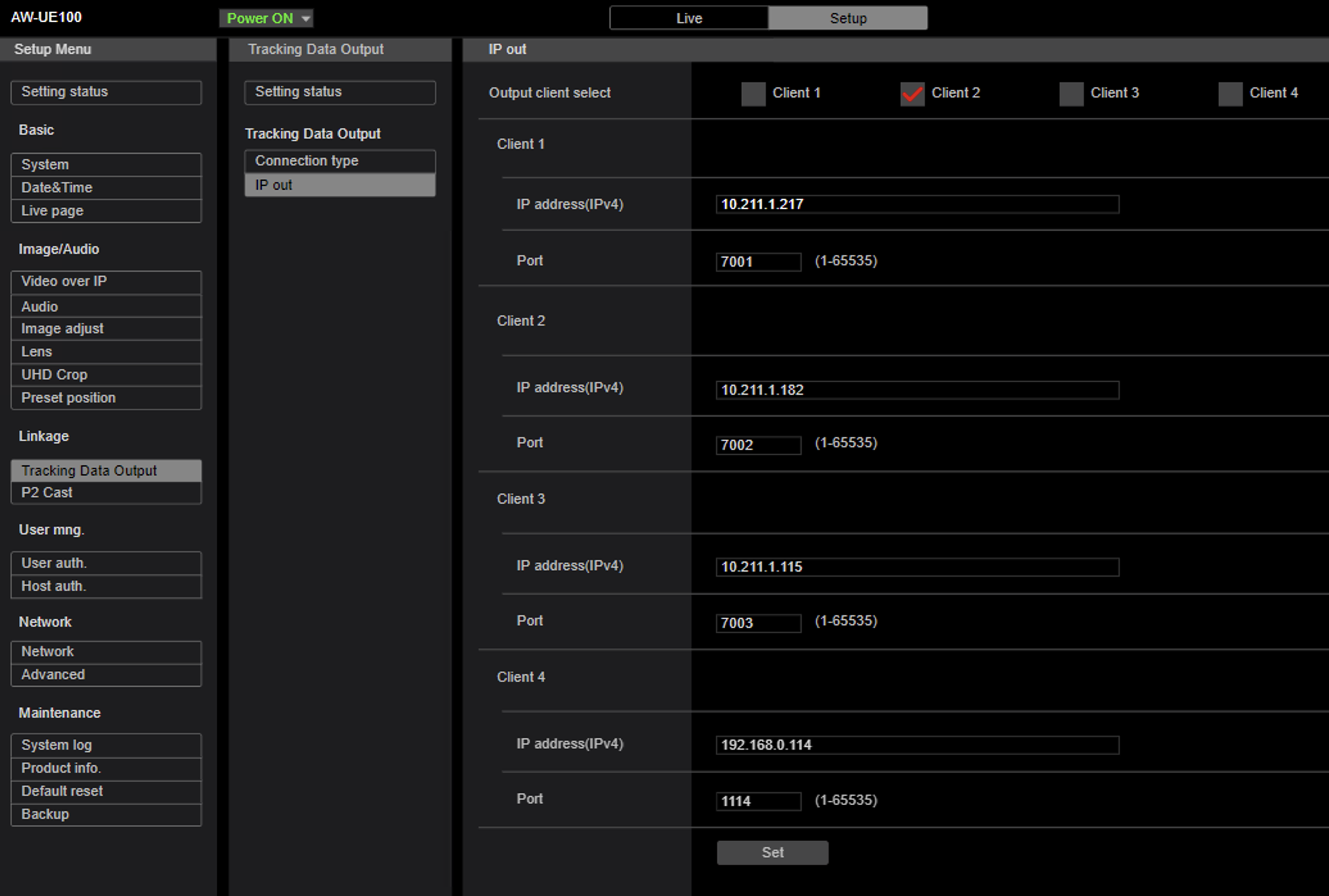 There is also need to activate tracking data output of the camera. Activate one client and enter the IP address of the Tracking Hub. The camera then sends the UDP packets to the tracking driver of the Tracking Hub.