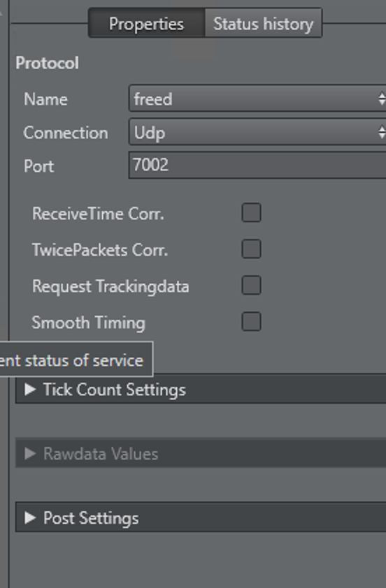 Add a new Tracking Driver and select freed as protocol. Enter the port number, which was selected in the setup section of the cameras user interface. In this example, it is 7002. Then right click on the Tracking Driver and select connect. The tracker changes to green if all values were set correctly.