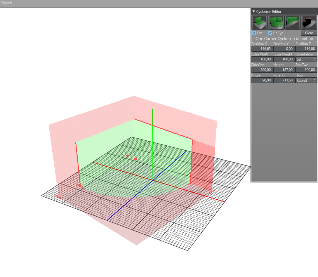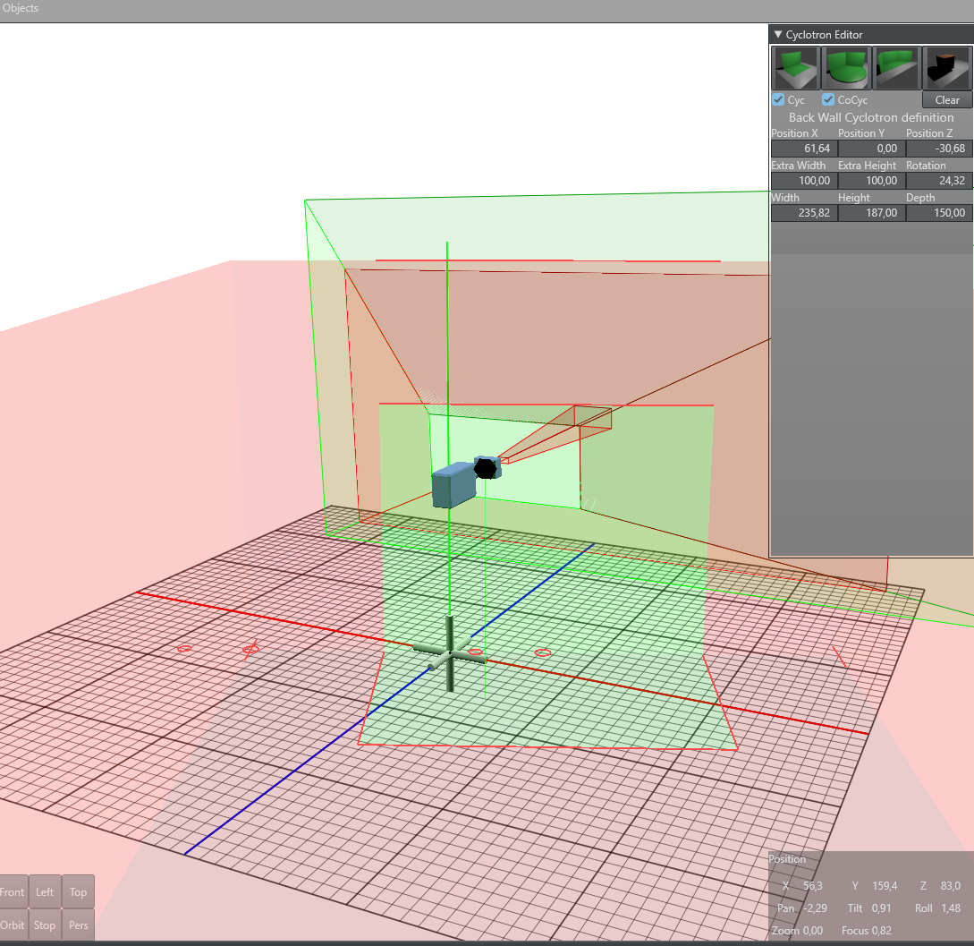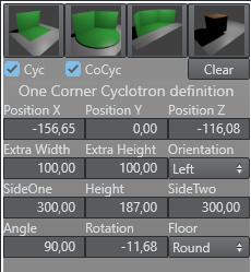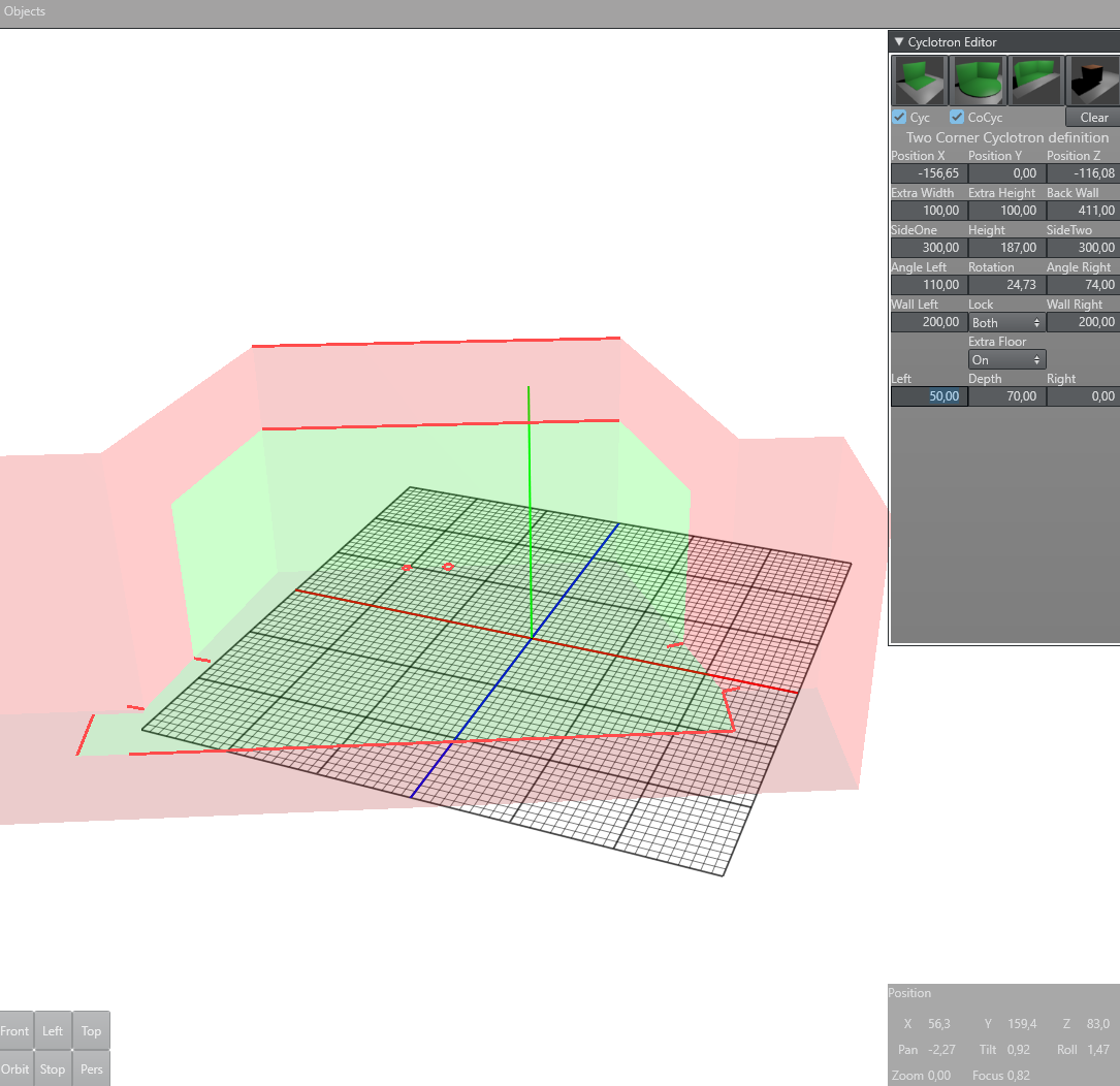 For every Cyc model, six common parameters can be defined. The position, rotation (Y-Axis), Extra Height and Extra Width. Extra height defines the distance from the top of the Cyc wall to the ceiling of the room. Extra width defines room size around the green wall and floor area.
