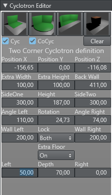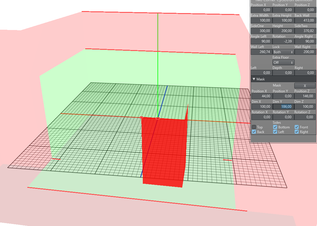 The Two Corner Cyc is defined by the length of SideOne and SideTwo, two opening angles (AngleLeft and AngleRight). It is possible to define the green area of the sides shorter than the side itself. This can be done with the parameters Wall Left and Wall Right. It is also possible to define an extra floor area. This extra floor is added in front of the green walls and extends the shape of the floor.