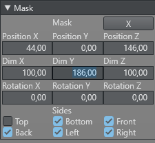 For any CYC model, any amount of Masks can be added. Masks are elements which will be added to the CoCyc walls. For any mask element the position, scale and rotation can be defined in the Cyc Editor. It is also possible to select for every sides of the cube if it should be rendered or not. In the tracking hub, the amount of masks is not limited.