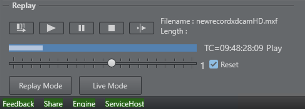 The Feedback Section reflects the clip channels feedback given from the Engine. During connect, the Replay Tool registers several feedback channels. One of them is the clip loaded feedback, which is triggered when a clip is ready for replay in the Engine. Therefore, Clip Name reflects the actual clip loaded in the Engine. If you try to load a clip with the Take button and the name does not appear in the Clip Name field, something went wrong or the clip is not playable. Please refer to the Viz Engine console for error messages.