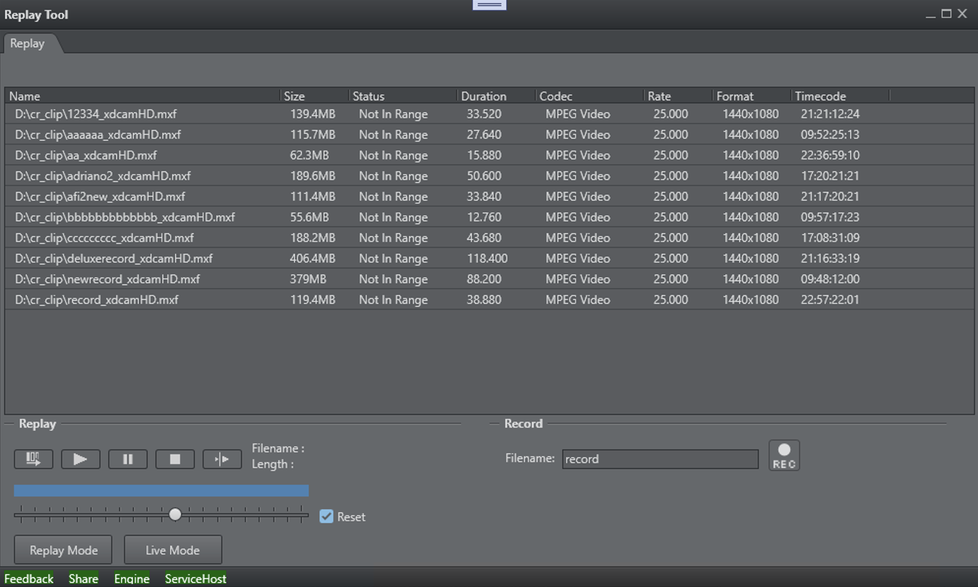 The Replay Tool can be used to record time code stamped clips with the help of Service Host and a Channel Recorder plug-in. Any time code which is readable by Viz Engine can be used. Most cameras already insert at least one readable time code.