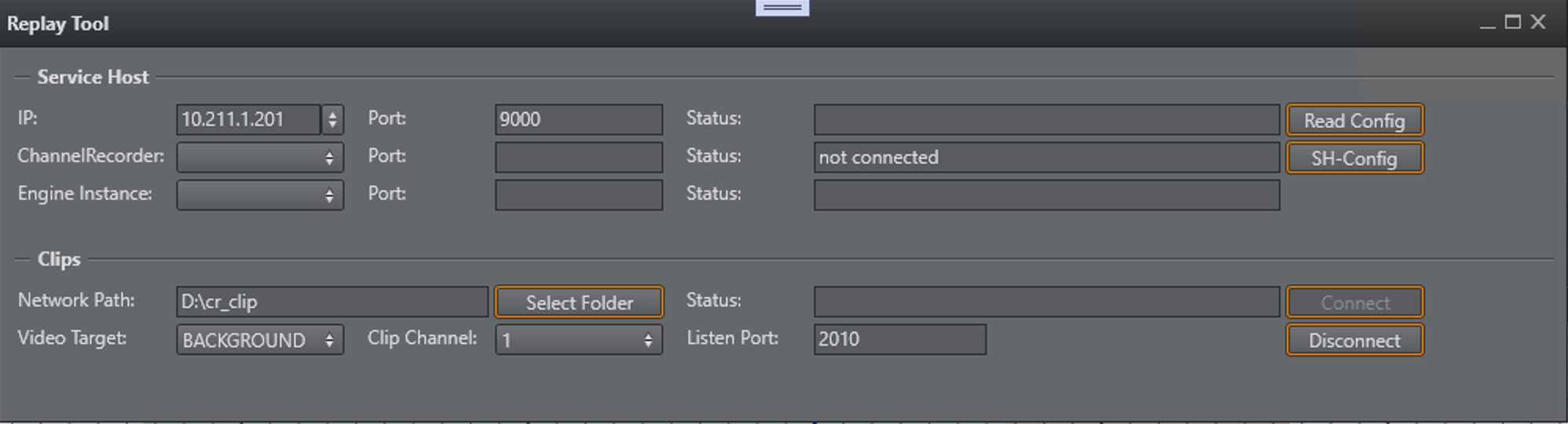 The next step is to connect a clip folder. If the Replay Tool runs on the same machine as the Engine, you can simply select the clip folder which was configured during Service Host and Channel Recorder installation. If the control runs on another Engine, it is necessary to map the clip folder from the Engine to the local machine, the Replay Tool is running.