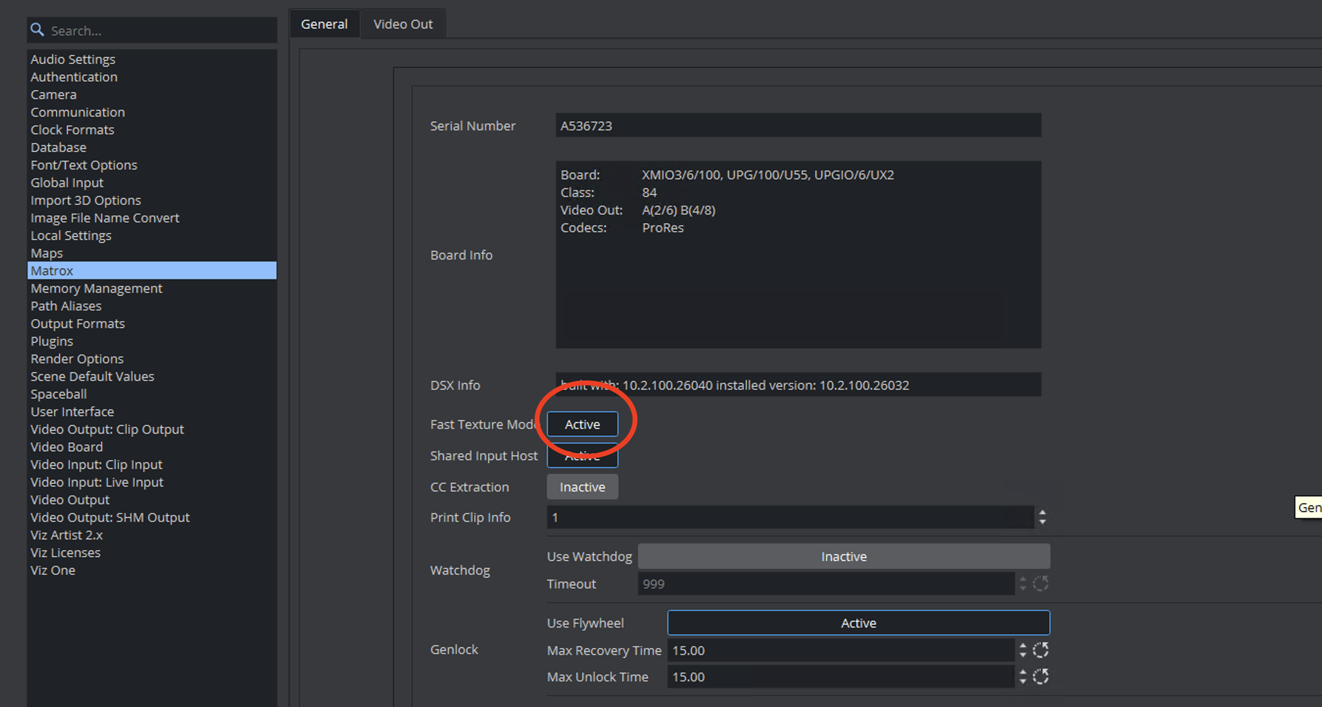 ############################SECTION MATROX_CONFIG################################ matrox devices common##Matrox.Devices = A536723## Enable fast texture input mode.## ATTENTION: in this mode DVE will not work.#* Matrox.FastTextureMode: Default=0Matrox.FastTextureMode = 1## Set this to true, if the physical inputs on this engine are to be used as shared resources in additional engine instances.#* Matrox.InputHost: Default=0Matrox.InputHost = 1After that, go to the Clip in channel: 1 section.