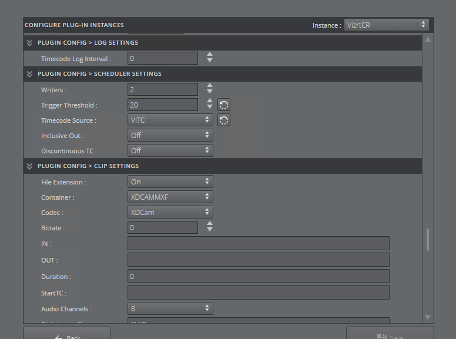 Scroll down to the Scheduler Settings and select VITC as Timecode Source. In the clip settings the codec and container can be selected. For more information on what codec and container is usable for the selected resolution in Viz Engine, please refer to Channel Recorder > References and Specifications > Supported Codecs in the Service Host Administrator Guide. If recording does not start, check the log file of the Channel recorder and follow the instructions there.
