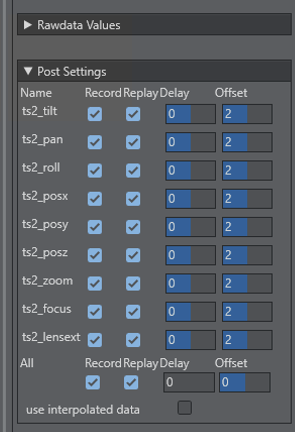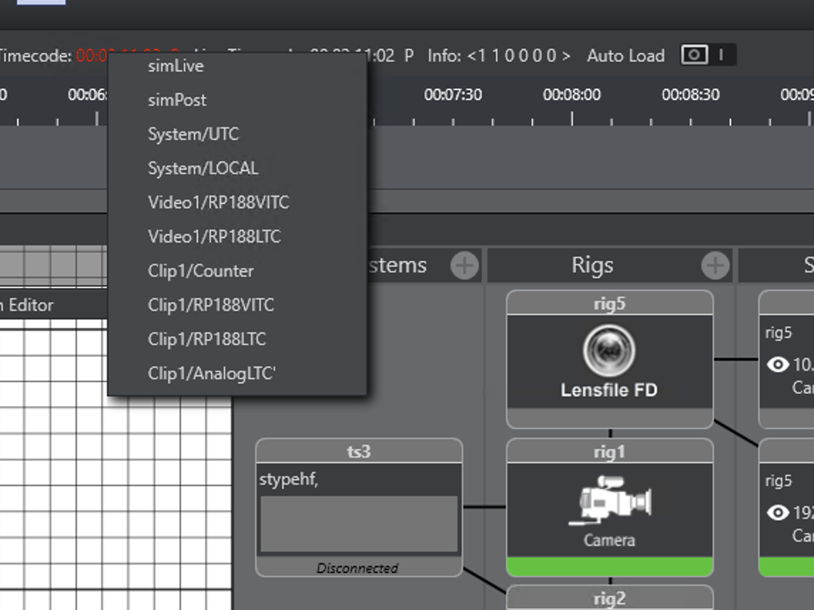 Please refer to the section Post System and configure the setup for recording. To receive time codes from the Engines, add a Timecode service and connect it to the Engine. Tracking Hub requests all time code sources from the Engine and adds them as sources in the post settings. The Engine must be On Air when the service is activated, otherwise the commands to receive the time code services fail.