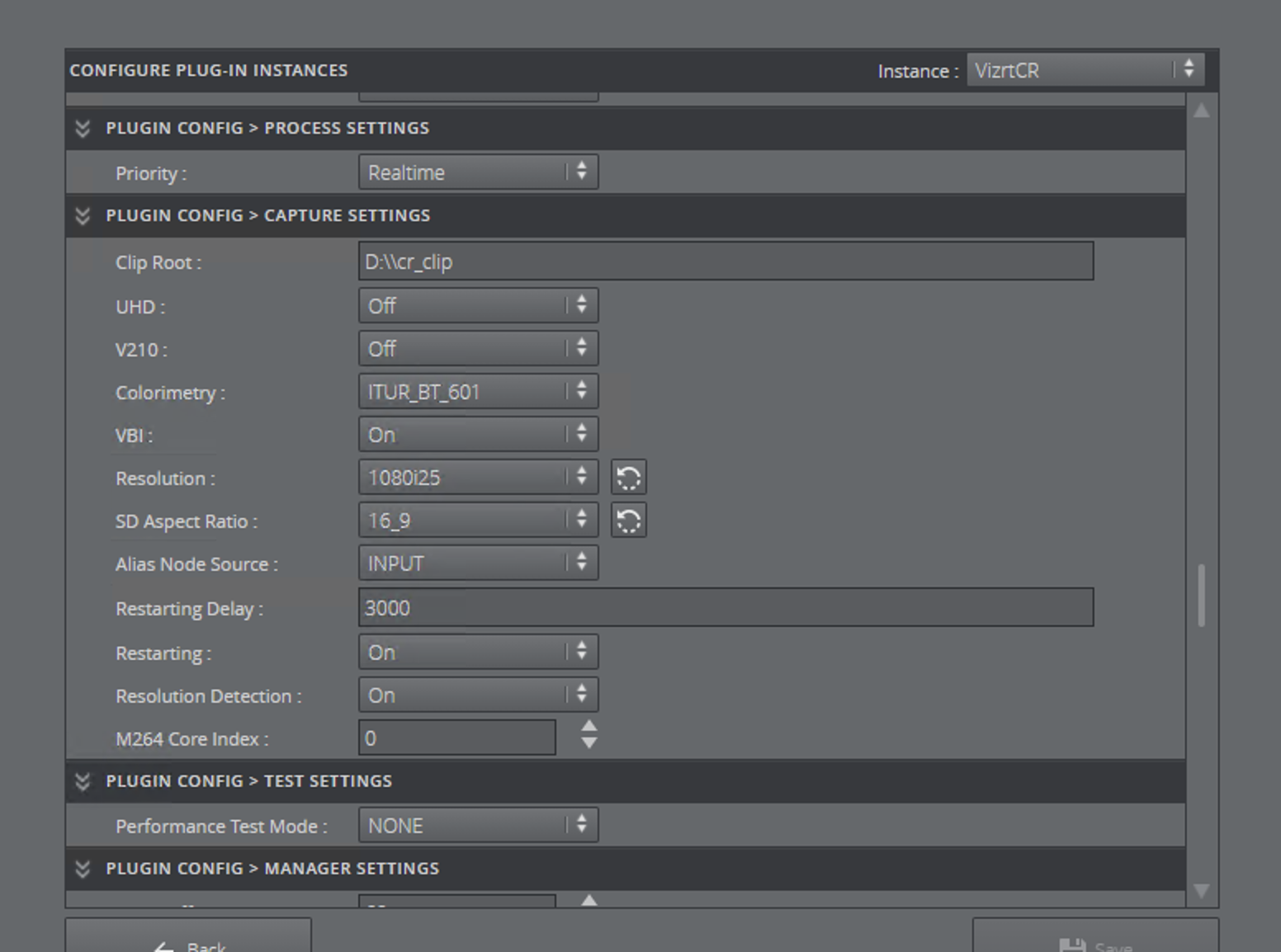 The next step is configuring the plug-in. In this example, Input connector A is used for recording. The clip folder is located at D:/cr_clip. The plug-in stores all recorded clips in this folder. Select the video resolution and aspect ratio needed for recording record.