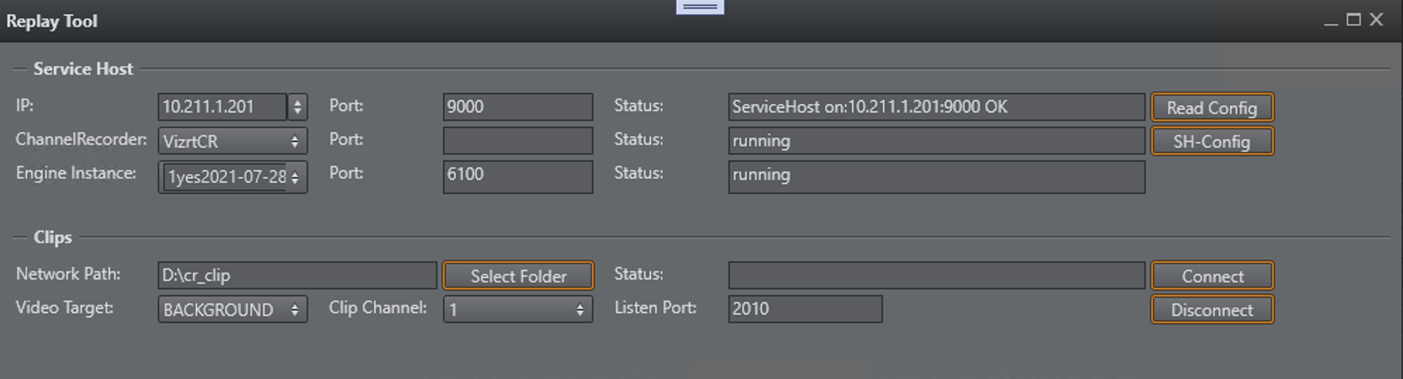 The Replay button sets the selected clip channel as FOREGROUND or BACKGROUND depending on which source was selected in the connect dialog.