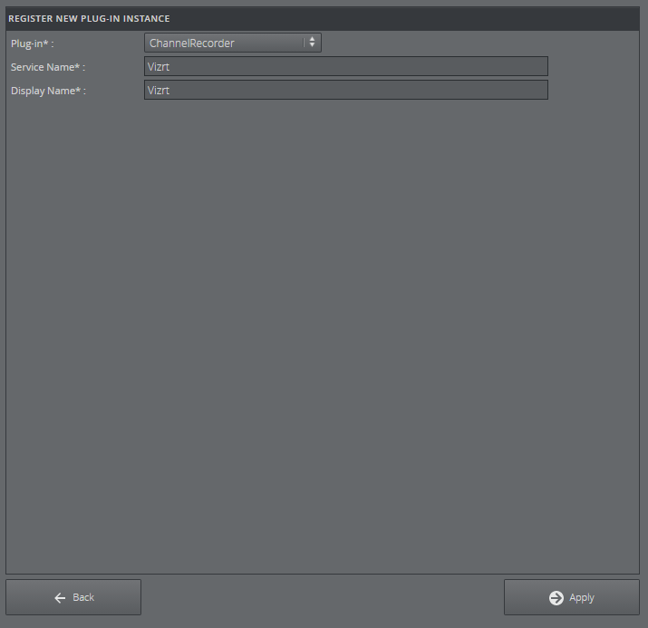 Open the Service Host UI in a web browser. Click on Configuration > Plugin > Register New Instance. Select ChannelRecorder and then click on Apply.