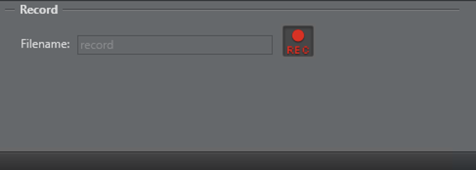 The Record tab is used to start or stop the recording of a new clip. If not recording, a clipname can be entered in the filename field. The filename is then extended by the channel recorder plug-ins and used for the new clip. Pressing on the REC button starts recording.