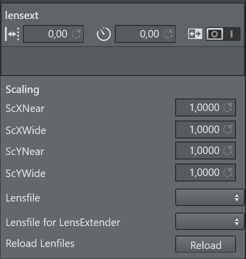 The only trackable parameter in the rig is the lensext parameter. In some protocols, such as FreeD, the lens extender is tracked. The value of lensext can be 0 or 1. If it is 0, the first lens file is used. If set to 1, the second lens file is used. The scaling values define a scale factor for the field of view with respect to the actual zoom value. ScYNear and ScXNear are the scaling factor when the lens is completely zoomed in. ScYWide and ScXWide define the scaling factor when the lens is completely wide. Between Wide and Near, the values are interpolated. If you do any changes inside the lens file or add some new, you must press Reload to make them available in your configuration.