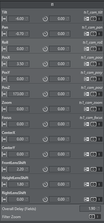 The Camera Rig represents the simplest camera known in the Tracking Hub. It holds the rotation and position parameters of a real camera in the studio. Zoom and Focus (in raw format coming from an encoder) and the Front, Height and Right lens shifts which are coming from the mount of the camera.