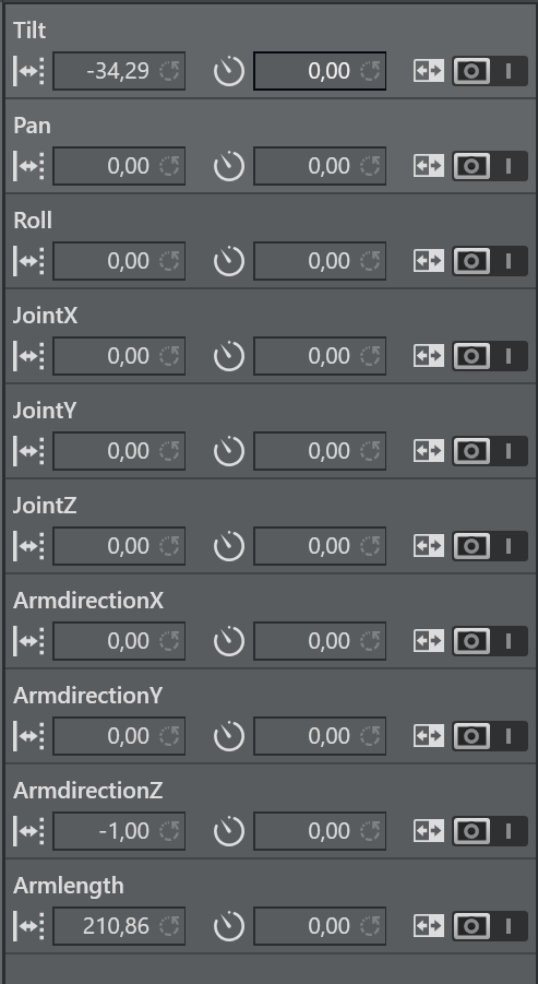 The Arm rig is mainly used for Spidercam setup, or anywhere a mounted arm follows a rotation axis. The rig does not include any head length or angle adjustments to the next child. All rotations that go into the Tilt, Pan and Roll axis are given to the next sibling. It is possible to set JointX, JointY and JointZ values to adjust mounting offsets between the position giving element and the arm.