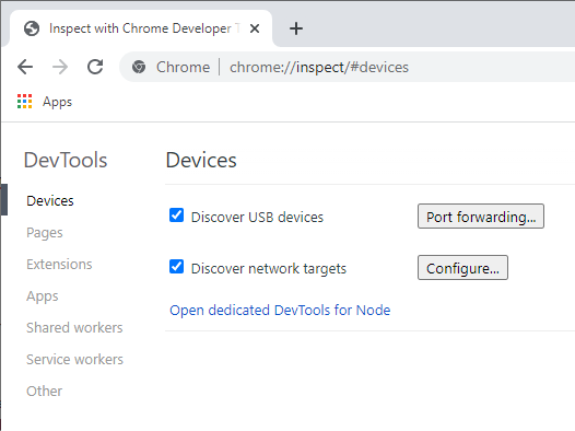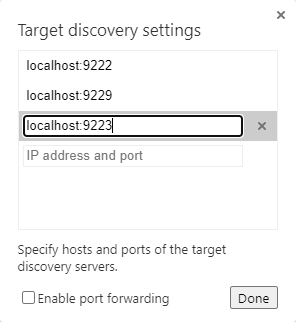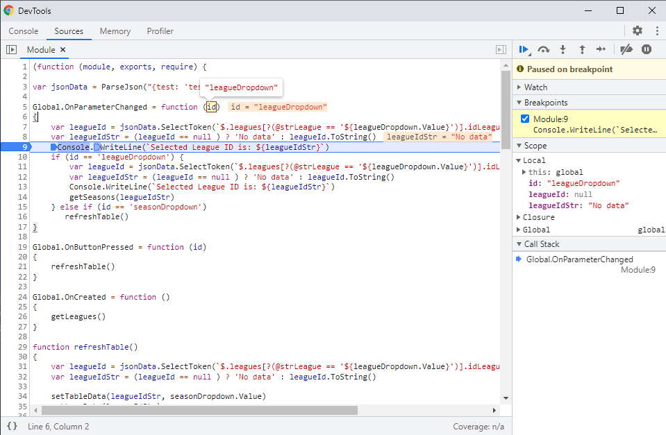 Note: There are two different ports in use: One for the global script (default 9222) and one for template scripts (default 9223). Template scripts can be debugged only when running in the designer. The ports can be configured in the global configuration settings.