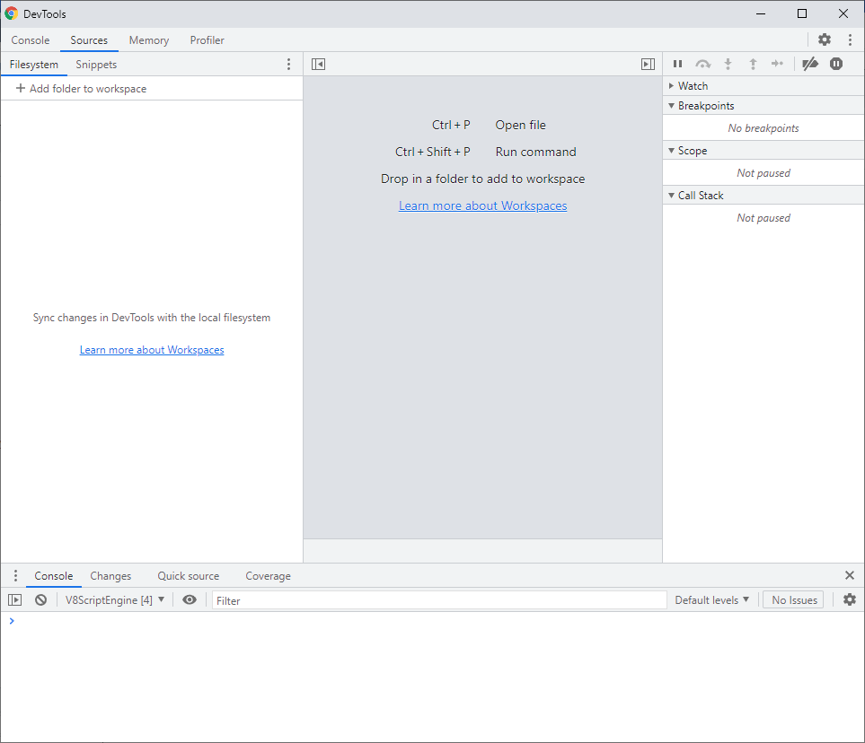 Click the inspect link to open the debugger. The first time you open the debugger it does not show any code.