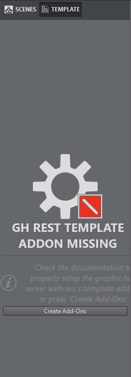 You can also import the add-ons through Viz Arc. When Viz Arc detects a missing add-on, e.g. on the template section, you can use the Create Add-Ons button to import the above archive automatically. After importing the archive you will be able to create and import templates and store projects on Graphic Hub.