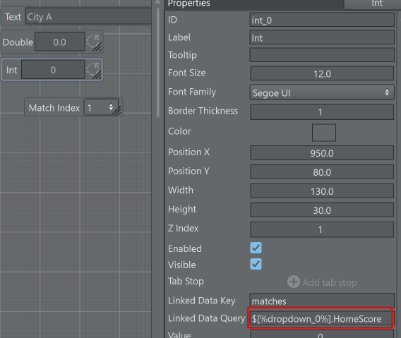 $[%dropdown_0%].HomeScore gets resolved to $[1].HomeScore as the dropdown value of the dropdonw_0 component is 1.