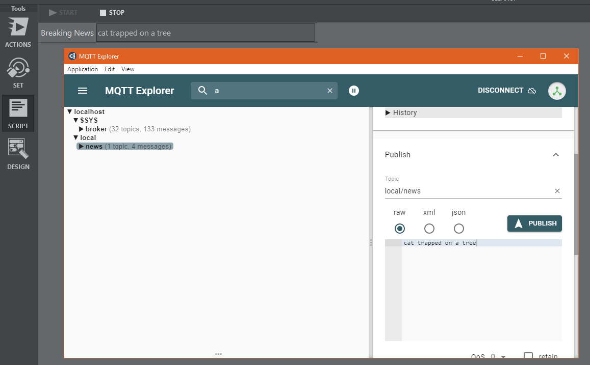 // using nuget package MQTTnet.AspNetCore and MQTTnet.Extensions.ManagedClient using MQTTnet;using MQTTnet.Client;using MQTTnet.Client.Options;// ...var factory = new MqttFactory();IMqttClient mqttClient = factory.CreateMqttClient(); // create MQTT clientvar options = new MqttClientOptionsBuilder().WithTcpServer("localhost", 1883).Build(); // create connection optionsvar connResult = mqttClient.ConnectAsync(options, CancellationToken.None).Result; // connect to VizArc's MQTT brokervar message = new MqttApplicationMessageBuilder().WithAtLeastOnceQoS().WithTopic("local/news/breaking").WithPayload("breaking news").Build(); // create messagevar result = mqttClient.PublishAsync(message, CancellationToken.None).Result; // publish the messageViz Arc JavaScript Sample to Receive and Read MQTT Topics through the DataMap