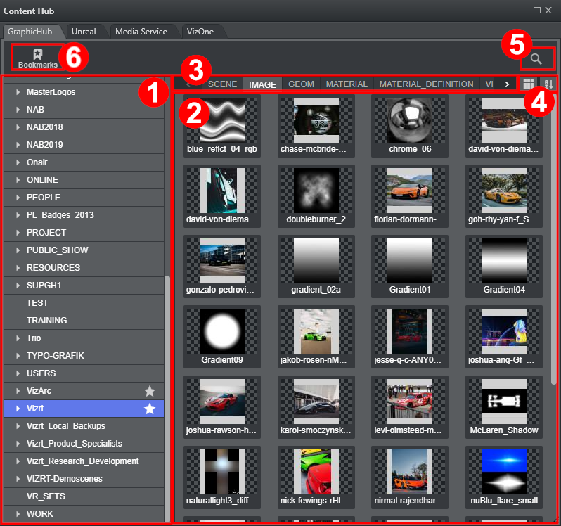 This section guides you through the functionalities of the Graphic Hub Browser, a web-based tool integrated in Viz Arc that allows you to browse for assets and media in the Graphic Hub.