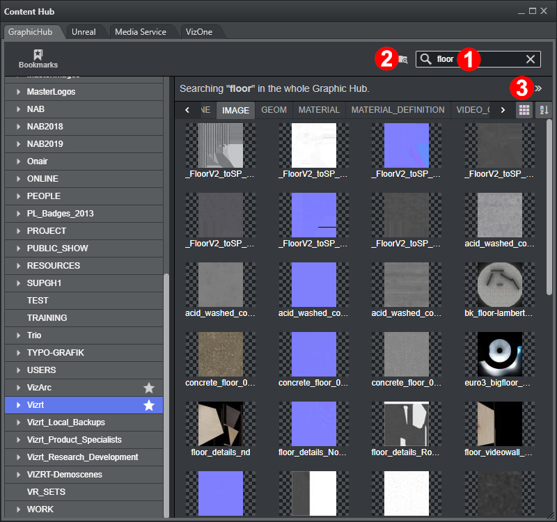 Here, you can switch between various Assets Type defined by the Graphic Hub, each one represented by a tab. You can only browse one kind of assets at a time. The available types are shown according to the Asset you are looking for. For example, if you are looking for an image, solely the IMAGE tab is available.