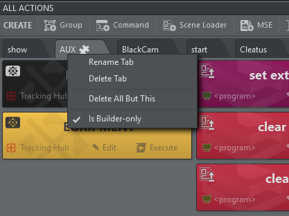 In Builder Mode you can right click on an action tab and select Is Builder-only. A small icon shows that the tab is Builder-only, the entire tab does not appear in On Air Mode. This prevents users from inadvertently executing actions that should not used during On Air operations.