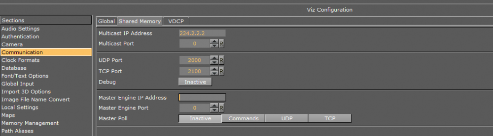 Click on the small triangle at the right of each Engine to see more details about the current Engine configuration. The first two entries show the shared memory communication port settings, which can be used with scripting or SHM. To configure the Shared Memory ports on Viz Engine, go to Viz Engine configuration under Communication > Shared Memory where you can configure UDP and TCP ports for Shared Memory updates.
