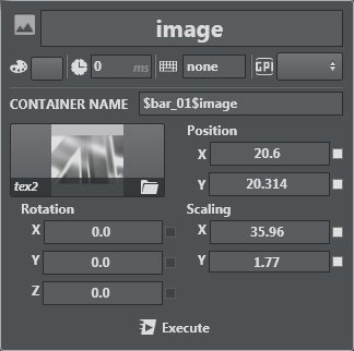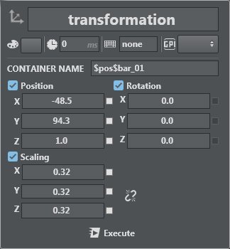 Transformation lets you set position, rotation and scaling of the selected container. You can also scale in proportion by clicking the Lock icon  next to the scaling panel. Position, Rotation and Scaling can be disabled using the check boxes. When disabled, those parts are not being sent to the Engine on execution. For example, when selecting Rotation only, only the rotation of the target container is affected on execution.