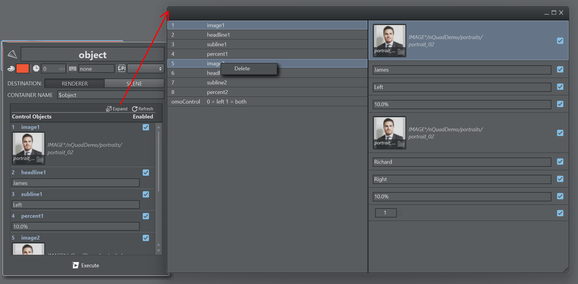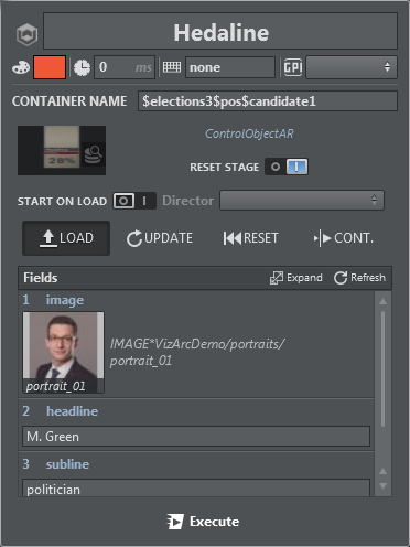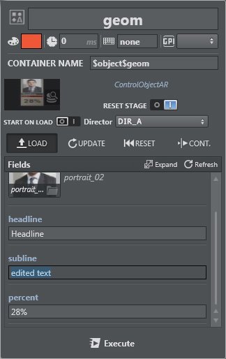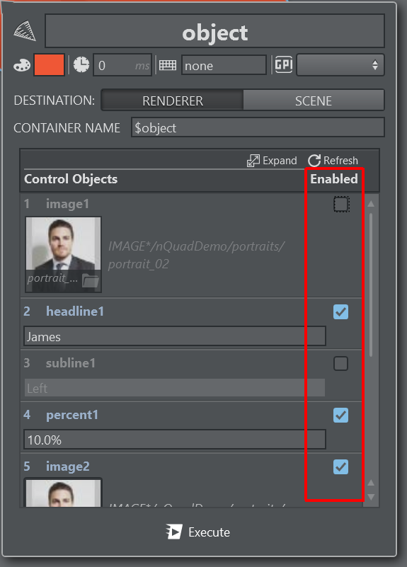 In some cases you might want to send only a subset of the entire Payload. Use the Enabled toggle flag for each Control Object to enable or disable setting the specific property on the Viz Engine. It behaves similar to the delete option described above, but in this case you can re-enable the disabled Control Object easily.
