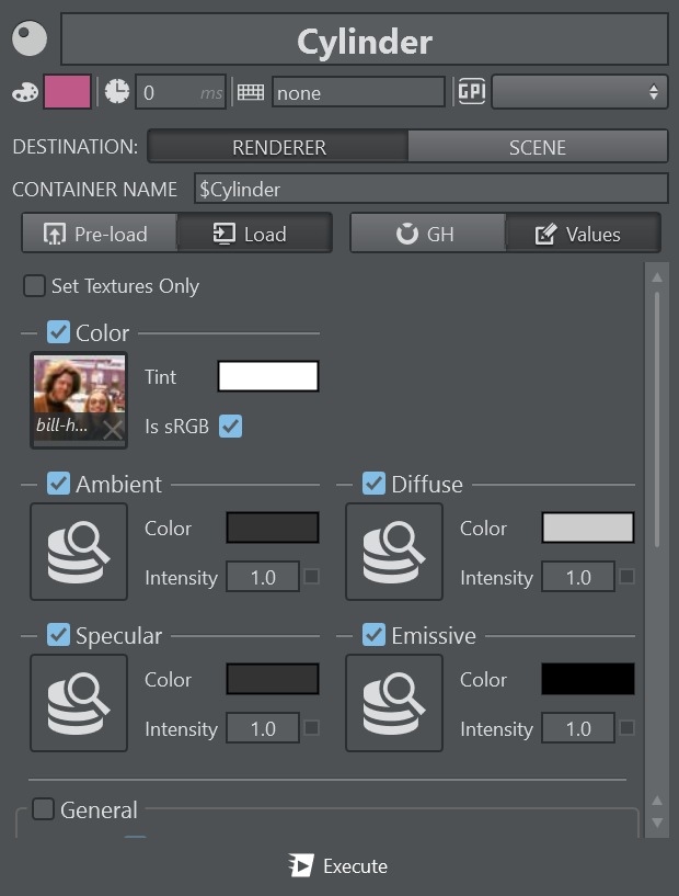 Analog to the PBR Material, the action can be executed in two modes: Pre-Load or Load. Pre-Load preloads all the images present in the action on the Engine. Load effectively loads the Phong Material onto Viz Engine. Typically, you group all Pre-Load actions and execute them on Initialization, then trigger only the Load actions. Right clicking the action execute button always sends Pre-Load commands.