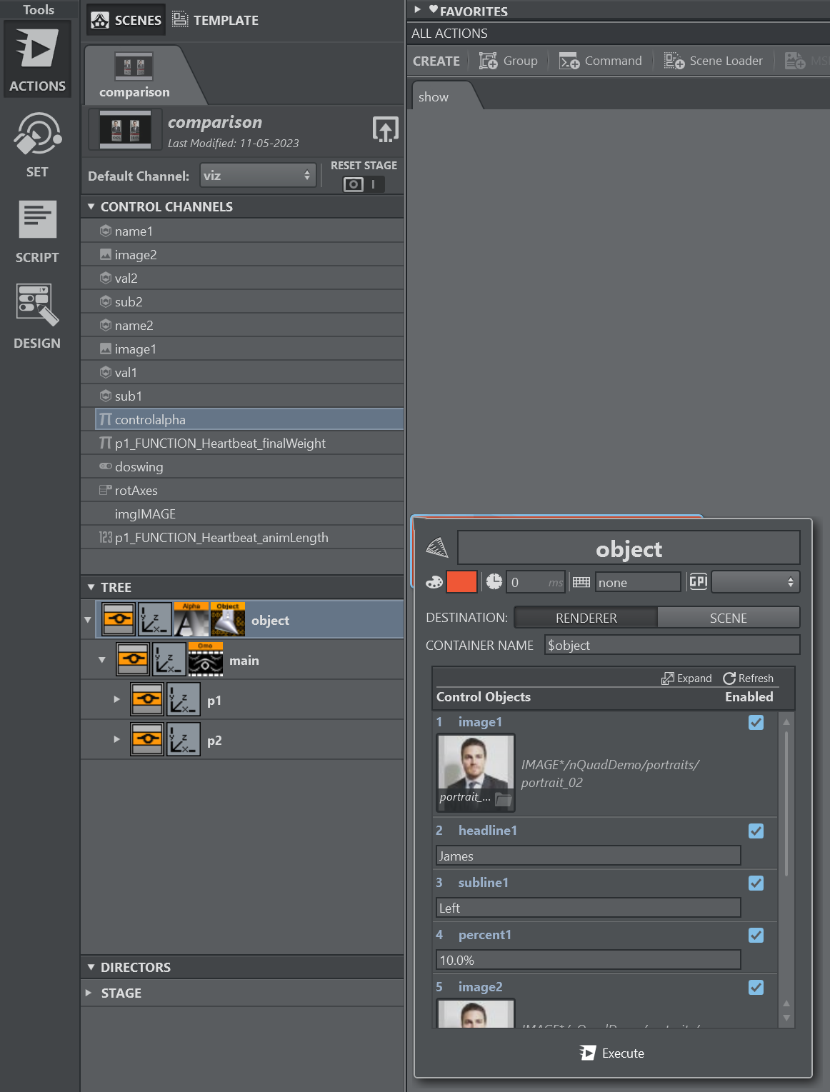 Control Object actions can be used by dragging a Control Object plug-in from the scene tree into the action canvas. It gives you a list of the Control Objects under the respective tree structure.