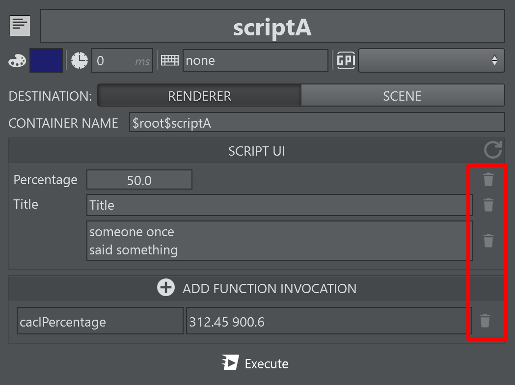 Use the small trash icons on the right hand side of each row to remove parameters that you don't want to send to the Viz Engine. Press the refresh icon to reload the script from the Viz Engine's scene. Make sure the scene is loaded on the Editing Engine.