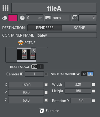 Specify the Scene to be loaded to be loaded into the viewport or Clear Scene to clear the currently loaded scene of the viewport. Select Reset Stage to reset the stage on scene load. Camera ID selects the camera to be used within the viewport scene.